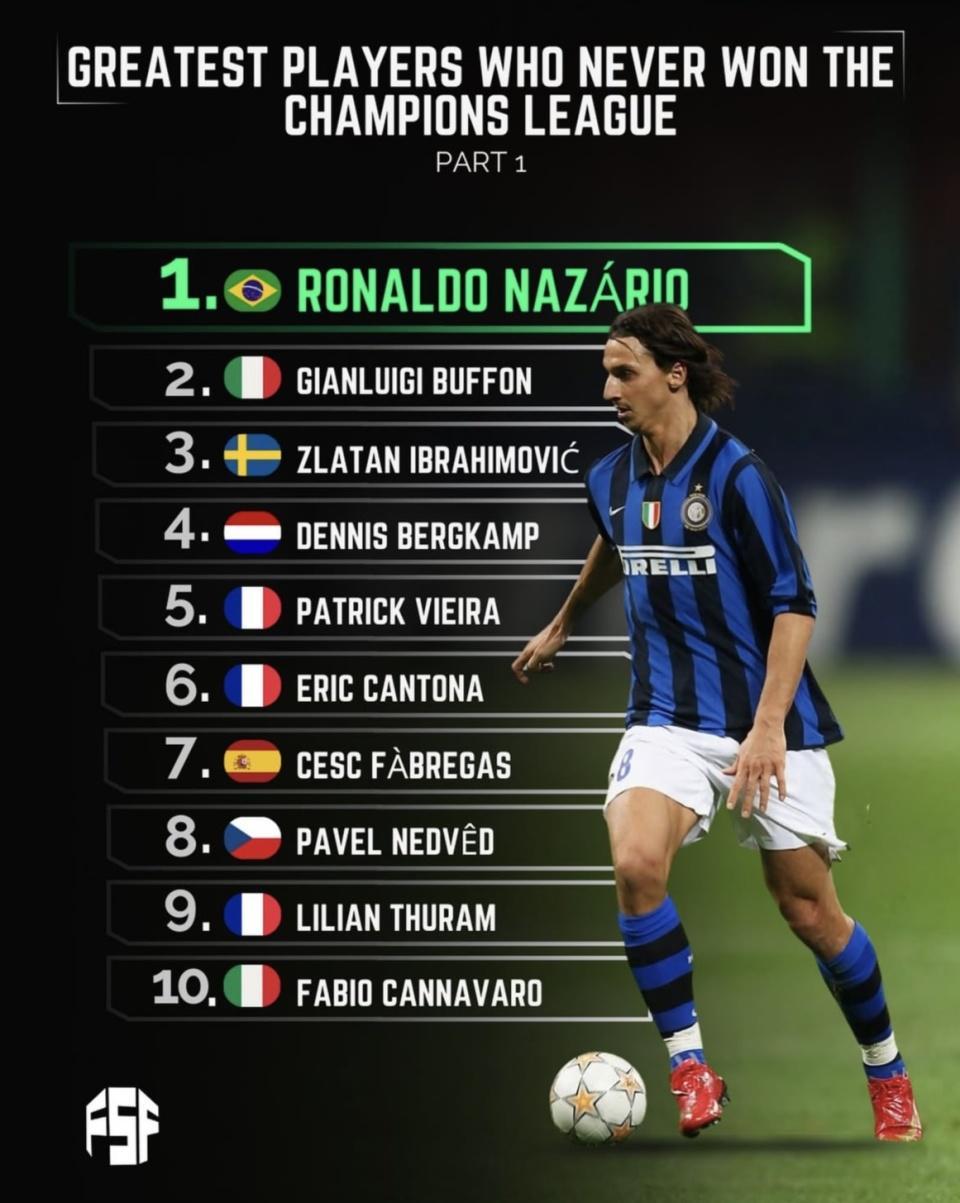 最近Fsf发布了“从未赢得欧冠冠军的最伟大球员”榜单第一部分,罗纳尔多、布冯、伊布、博格坎普、维埃拉这些名字都在列。名单里最刺眼的反差其实只集中在罗纳尔多身上:很多足球历史排名里,他往往被默认放进前十,甚至被放到更靠前的位置,可一翻欧冠冠军这一栏却是0,这种落差才会让人觉得特别别扭、特别尴尬——你越把他当成历史顶层的前锋,这个“0”就越显眼